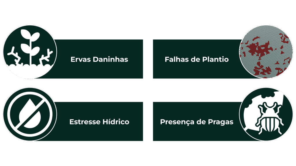 Durante o ciclo da cultura, fazemos o acompanhamento contínuo das lavouras. Nossos voos de monitoramento captam imagens de alta resolução que são analisadas por algoritmos para identificar: